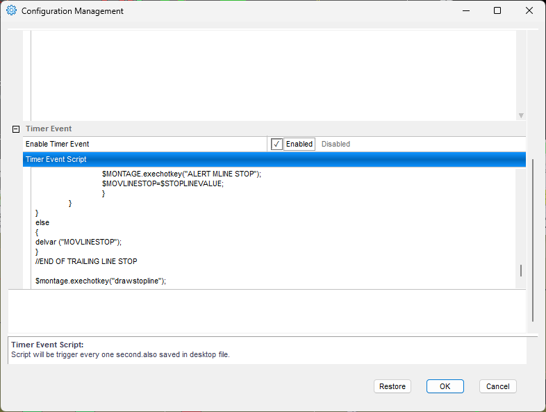 $montage.exechotkey("drawstopline");into the script area and it will get executed every second for you. I chose this area rather than chart update script as it I try to use chart update script only for things that really need fast execution and this one, being just an indicator, surely is not needed to be as quick.