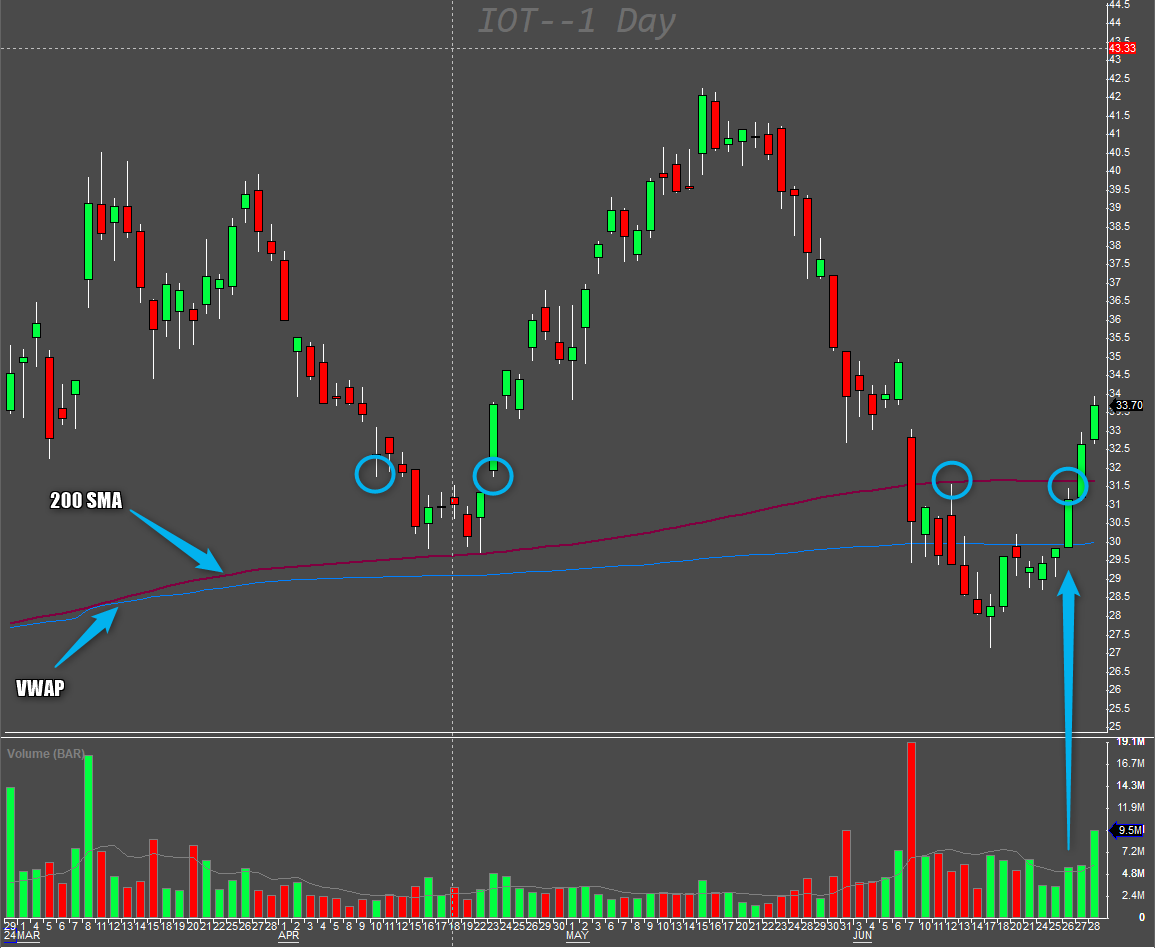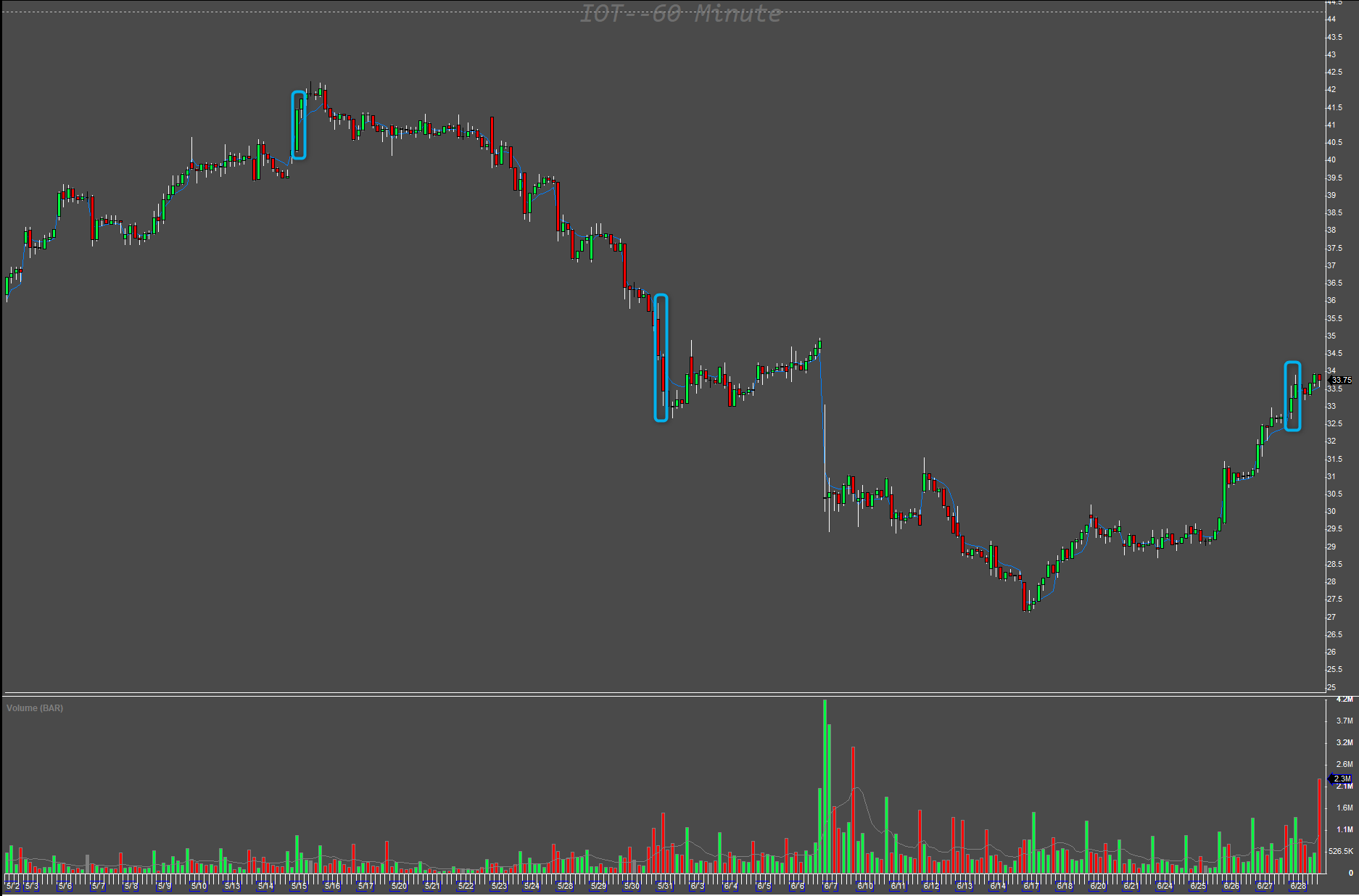 Let’s see it on the following chart, which is showing the Symbol IOT 0.00%↑ since the beginning of this year. This means it is a few hundreds of candles. We are looking for pairs of candles answering the hypothesis.